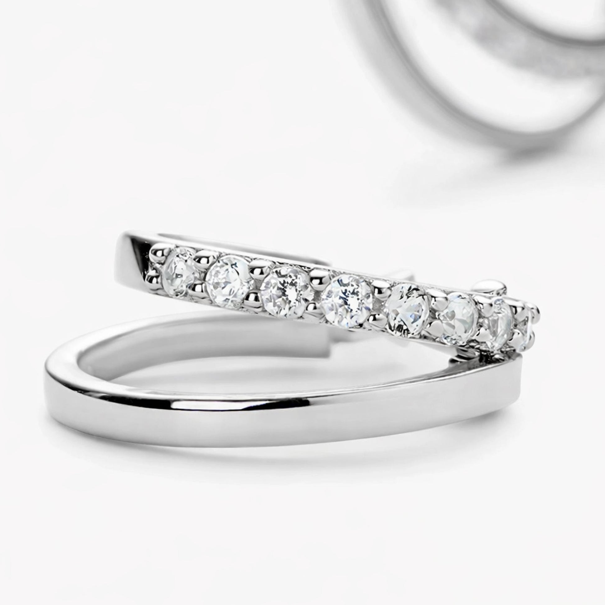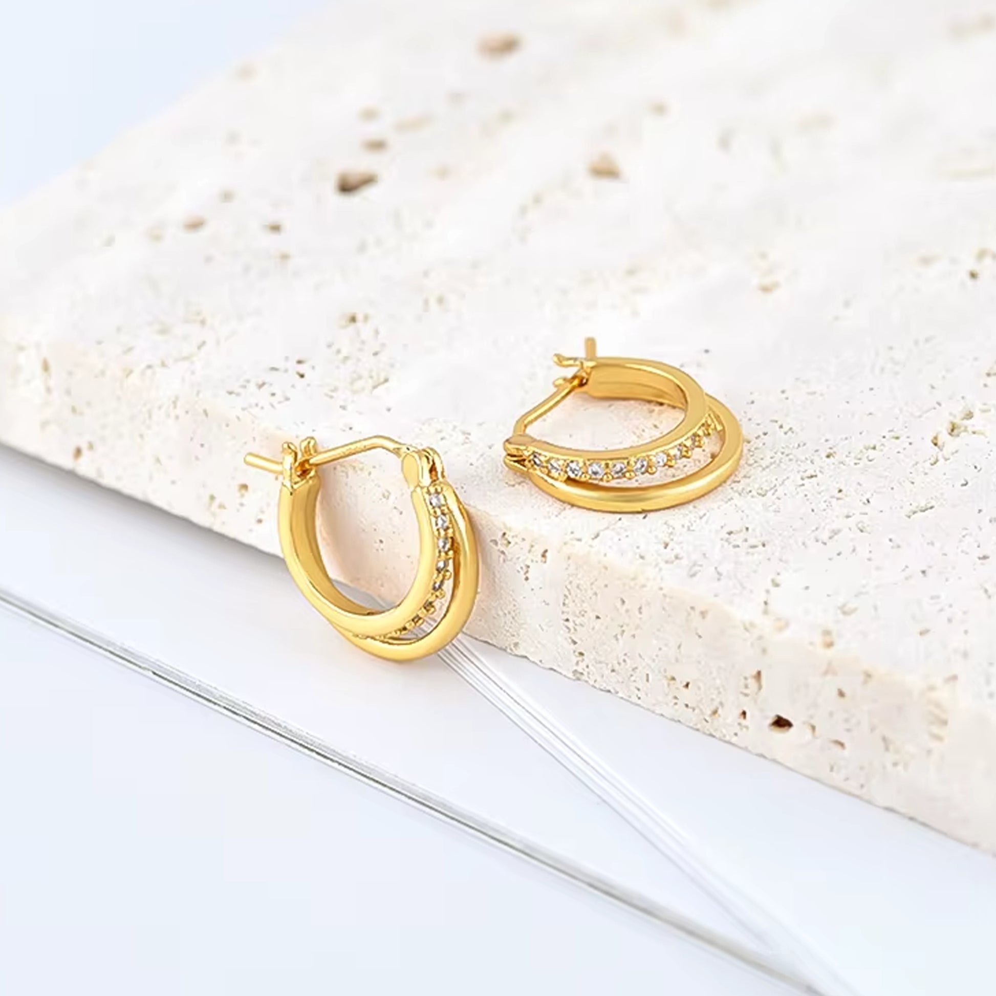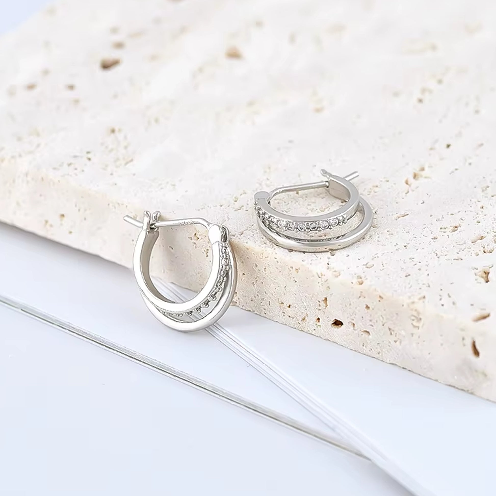 Expertly crafted from genuine 925 sterling silver and finished with a radiant gold plating and platinum, these huggie hoops feature a refined double-band silhouette adorned with sparkling cubic zirconia stones. Their compact 15.2mm size hugs the ear beautifully, making them ideal for daily wear, office looks, or special occasions.
